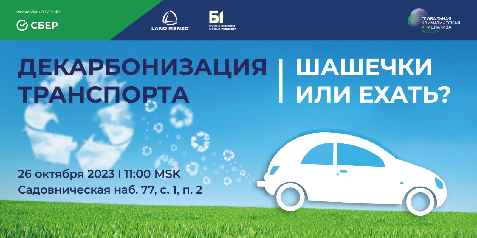 26 октября 2023 года Глобальная Климатическая Инициатива, Россия (Climate Governance Initiative Russia — CGI Russia) в партнерстве с ПАО «Сбербанк», «Ланди Ренцо Рус» и при поддержке Группы компаний Б1 проведет круглый стол «Декарбонизация транспорта: шашечки или ехать?».